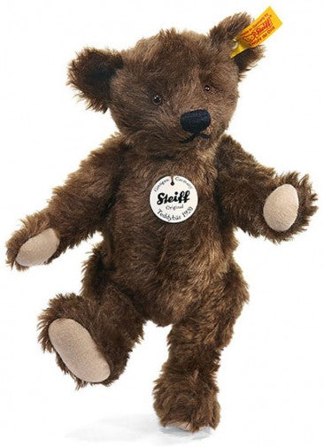 SH000805A Steiff Classic 1920 Teddy Bear in the style of the bears of the decade. He is made from lovely dark brown mohair with a straight, medium pile. His pale beige felt paw pads make a striking contrast. This style of bear has a short muzzle with a bold stitched nose. He also features sweet, low-set ears and amber pupil eyes.