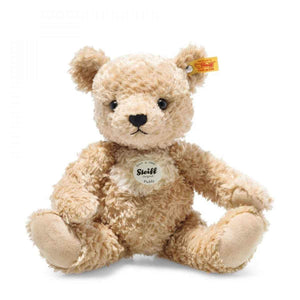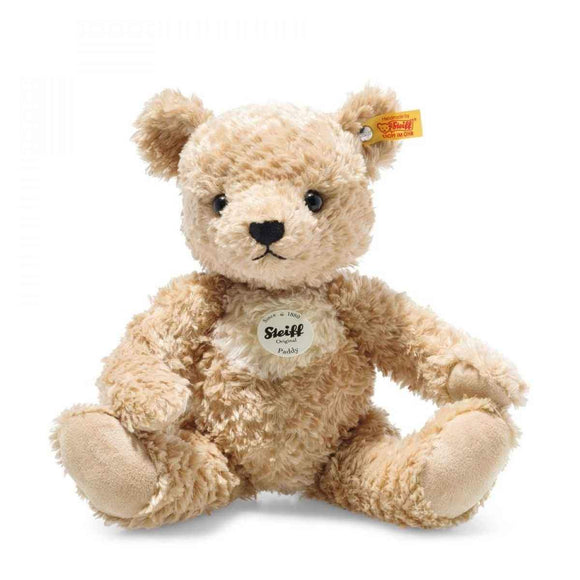 SH014253Paddy Teddy bear is 30 cm tall and made of cuddly soft plush fabric. He really looks so cuddly with his golden-brown fur and cream coloured breast. Paddy is 5-way jointed and has bean bags in his bottom so that he can sit stably. His mouth is stitched black. His unusually flexible head makes this young bear cub even more playful. Especially when he rocks his head to and fro.