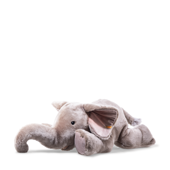 A new member of the Trampili family is here to brighten our days with his charming presence. Trampili elephant is 85 cm tall and has a soft and cuddly grey plush fabric coat. His inner ears and the soles of his feet are made of a lighter grey plush material. The inside of his mouth features pink velvet. The inner ears are painted pink. This well-travelled little guy loves to just lie there and relax. He's simply too cute to resist!