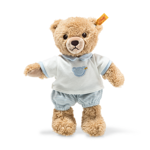 SH239571Steiff's Sleep Well Bear is your baby's perfect companion during sleep time or play time. Be confident your little one is perfectly safe with a genuine Steiff Teddy made of the cuddliest soft plush with no harmful dyes or materials. A white shirt embroidered with a Teddy bear head, and a genuine Steiff "Button-in-Ear" and matching striped pyjama completes this charming Teddy. Part of the Steiff Sleep Well Bear Collection. Machine Washable.